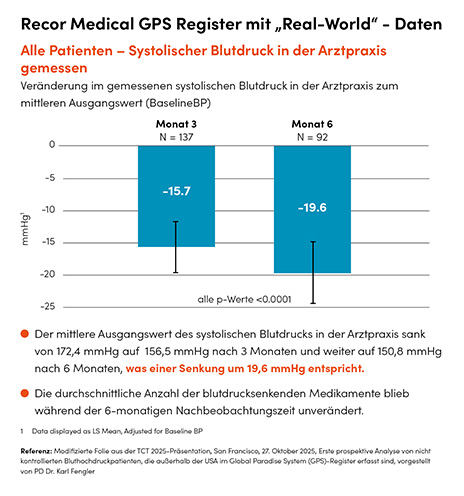 Referenzen: modifizierte Folie aus der TCT 2025-Präsentation, TCT 2025 San Francisco, 27. Oktober 2025, Erste, prospektive Analyse von unkontrollierten Bluthochdruckpatienten, die in das Global Paradise System (GPS)-Register außerhalb der Vereinigten Staaten aufgenommen wurden, vorgestellt von Dr. Karl Fengler, MD